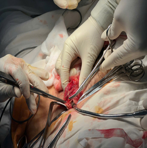 Kíp trực Ngoại của Bệnh viện gồm BSCKI. Lê Việt Khoa (Trưởng khoa Ngoại Tổng hợp) và BS.Nguyễn Quốc An cùng phối hợp với BS.Hồ Hoàng Nam (Khoa Gây mê Hồi sức) tiến hành phẫu thuật ngay cho bệnh nhân. Trong quá trình phẫu thuật, các bác sĩ phát hiện khối thoát vị là mạc nối ruột bên trong có ít dịch mủ, kèm dị vật hình que nghi là xương cá, các bác sĩ tiến hành lấy dị vật, đẩy các cấu trúc thoát vị vào ổ bụng, phục hồi thành bụng bằng phương pháp Bassini. Sau mổ, bệnh nhân tỉnh táo, sinh hiệu ổn định, được theo dõi tại khoa Ngoại Tổng hợp. Chiều ngày 08/10/2025, bệnh nhân đã ổn định và được cho ra viện.
