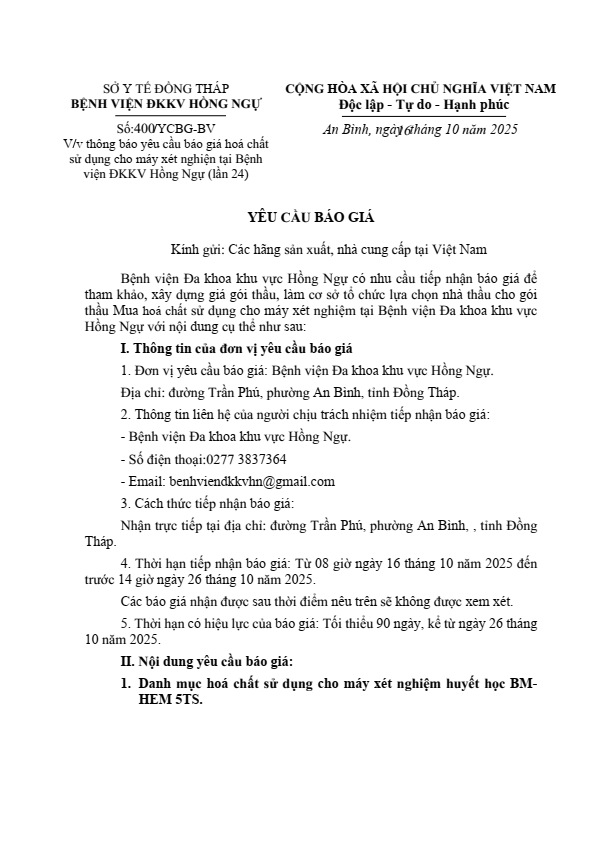 Bệnh viện Đa khoa khu vực Hồng Ngự có nhu cầu tiếp nhận báo giá để tham khảo, xây dựng giá gói thầu, làm cơ sở tổ chức lựa chọn nhà thầu cho gói thầu Mua hoá chất sử dụng cho máy xét nghiệm tại Bệnh viện Đa khoa khu vực Hồng Ngự với nội dung cụ thể như sau: