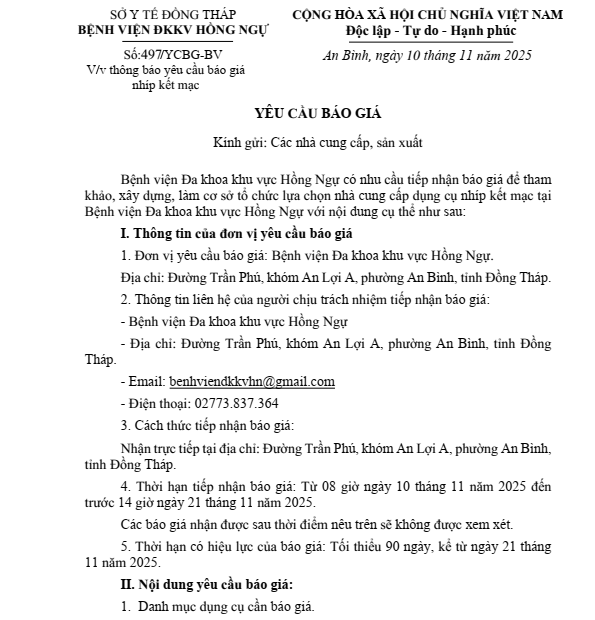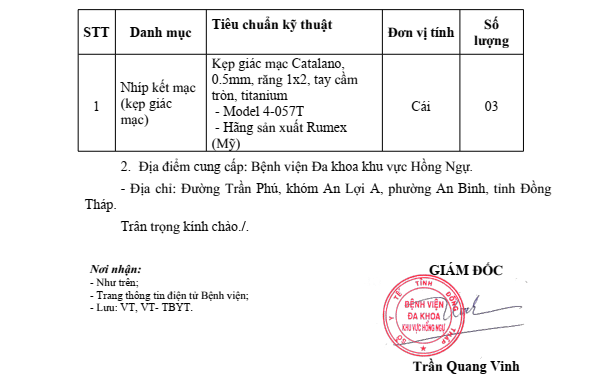 Bệnh viện Đa khoa khu vực Hồng Ngự có nhu cầu tiếp nhận báo giá để tham khảo, xây dựng, làm cơ sở tổ chức lựa chọn nhà cung cấp dụng cụ nhíp kết mạc tại Bệnh viện Đa khoa khu vực Hồng Ngự với nội dung cụ thể như sau:
