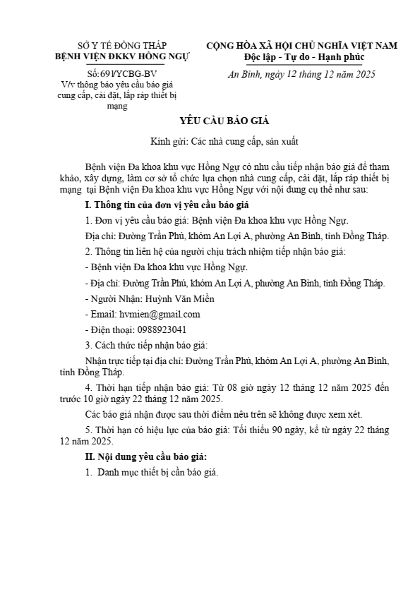 Bệnh viện Đa khoa khu vực Hồng Ngự có nhu cầu tiếp nhận báo giá để tham khảo, xây dựng, làm cơ sở tổ chức lựa chọn nhà cung cấp, cài đặt, lắp ráp thiết bị mạng tại Bệnh viện Đa khoa khu vực Hồng Ngự với nội dung cụ thể như sau: