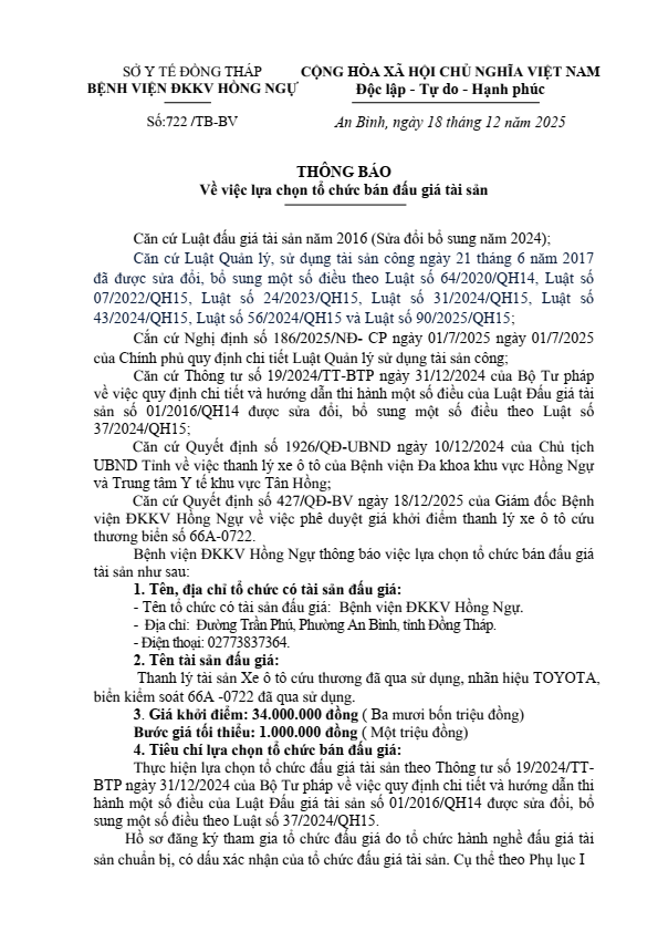 Thông báo về việc lựa chọn tổ chức bán đấu giá tài sản